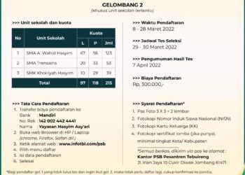 Pesantren Tebuireng Terima Santri Baru 7 Maret 2022 209 Setiap warga bangsa Indonesia ingin menjadikan anak mereka terdidik secara agama sebelum mereka menuntut ilmu dan pengetahuan secara luas. Maka, ...